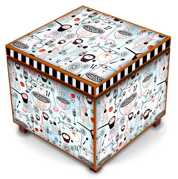A pattern of fish, pots, spoons, cupcakes and drinks.