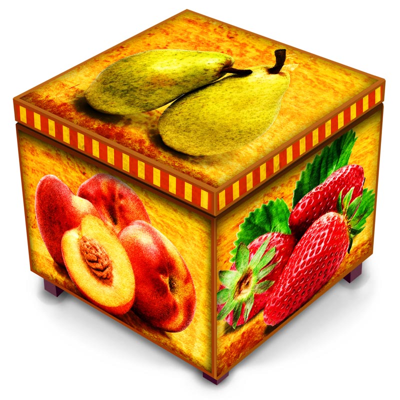 Distressed photos of pears, peaches, strawberries, rasberries, blackberries,bananas and an apple.