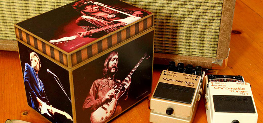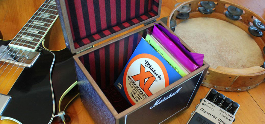 Made for guitar players, our guitar boxes are a great way to organize strings, picks and slides. Guitar boxes hold approximately 20 packs of guitar strings and come with a black velvet pouch to hold your picks, capos, etc. Our guitar boxes go to eleven!